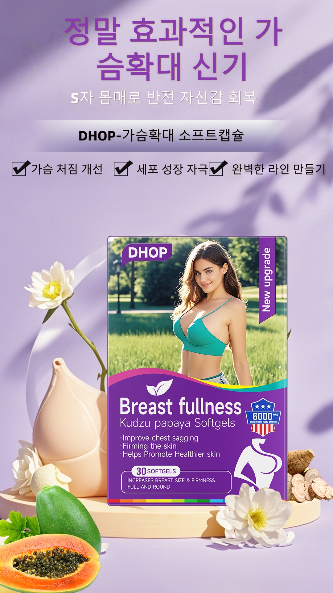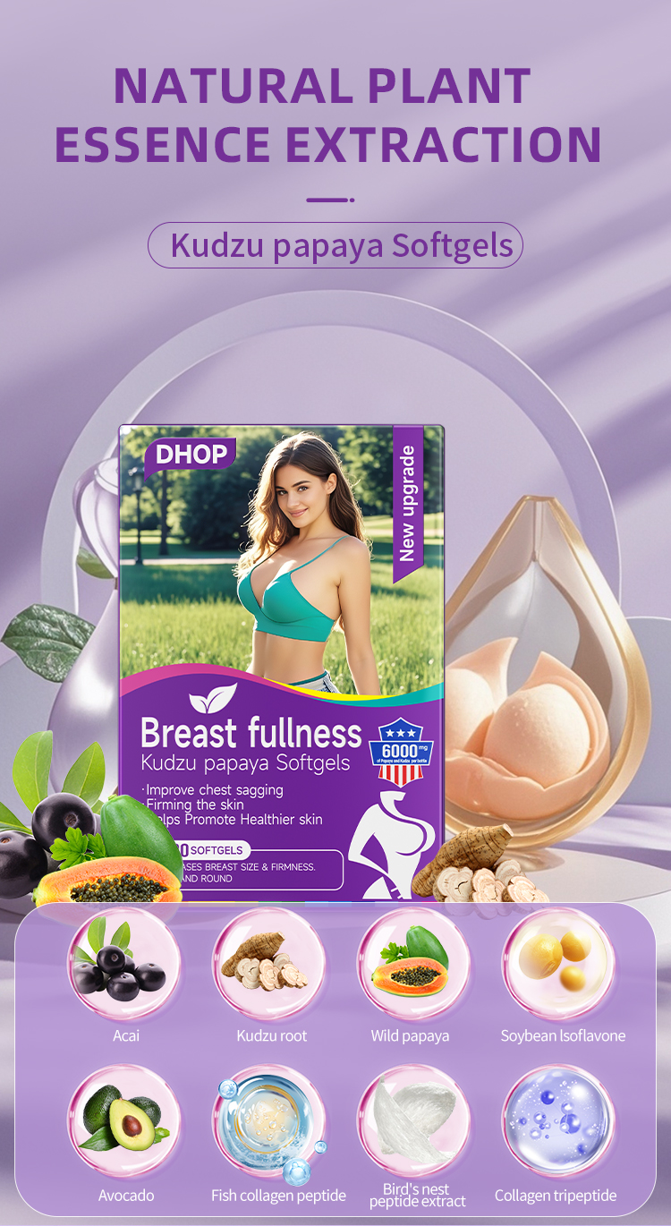 1. 파파야, 푸에라리아 로바타 등의 천연 가슴확대 성분으로 가슴을 소통시키고 2차 발달을 가능하게 하며 가슴 콜라겐의 재생을 촉진하여 가슴의 모양을 회복시켜 줍니다.
