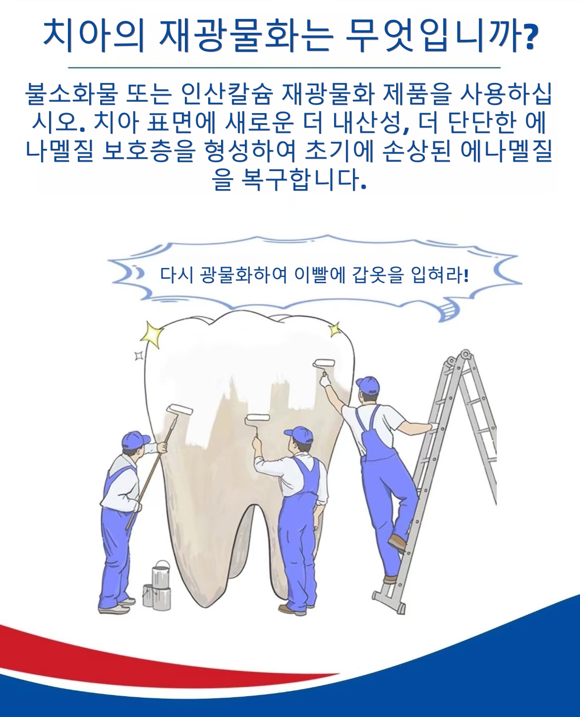 구멍 난 벽에 다시 퍼티를 긁어주는 것처럼, 재광화는 치아에 손실된 '본원 영양소'인 미네랄을 보충하여 미세한 손상 하나하나를 정확하게 메우고 초기 충치를 역전시켜 치아 법랑질 견고하고 윤기 있게 회복시키는 것입니다. ✨